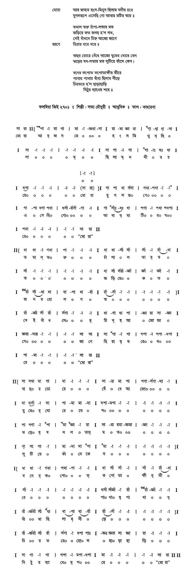 সমবেত : সারাদিন পিটি কার দালানের ছাদ গো পাত ভ’রে ভাত পাই না, ধ’রে আসে হাত গো॥ ১ম : তোর ঘরে আজ কি রান্ন হায়েছে? ২য় : ছেলে দুটো ভাত পায়নি, পথ চেয়ে রয়েছে। ৩য় : আমিও ভাত রাঁধিনি, দেখ্ না চুল বাঁধিনি শাশুড়ি মান্ধাতার বুড়ি মন্দ কথা কয়েছে। ৪র্থ : আমার ননদ বড় দজ্জাল বজ্জাত গো। সমবেত : সারাদিন পিটি কার দালানের ছাদ গো পাত ভ’রে ভাত পাই না, ধ’রে আসে হাত গো॥ ১ম : এত খায় তবু ওদের বউগুলো সুঁট্কো ২য় : ছেলেগুলো প্যাঁকাটি, বাবুগুলো মুট্কো। ৩য় : এরা কাগজের ফুল, এরা চোখে চাঁদ দেখে না। ৪র্থ : ইটের ভিতরে কীটের মত কাটায় এরা রাত গো। সমবেত : সারাদিন পিটি কার দালানের ছাদ গো পাত ভ’রে ভাত পাই না, ধ’রে আসে হাত গো॥