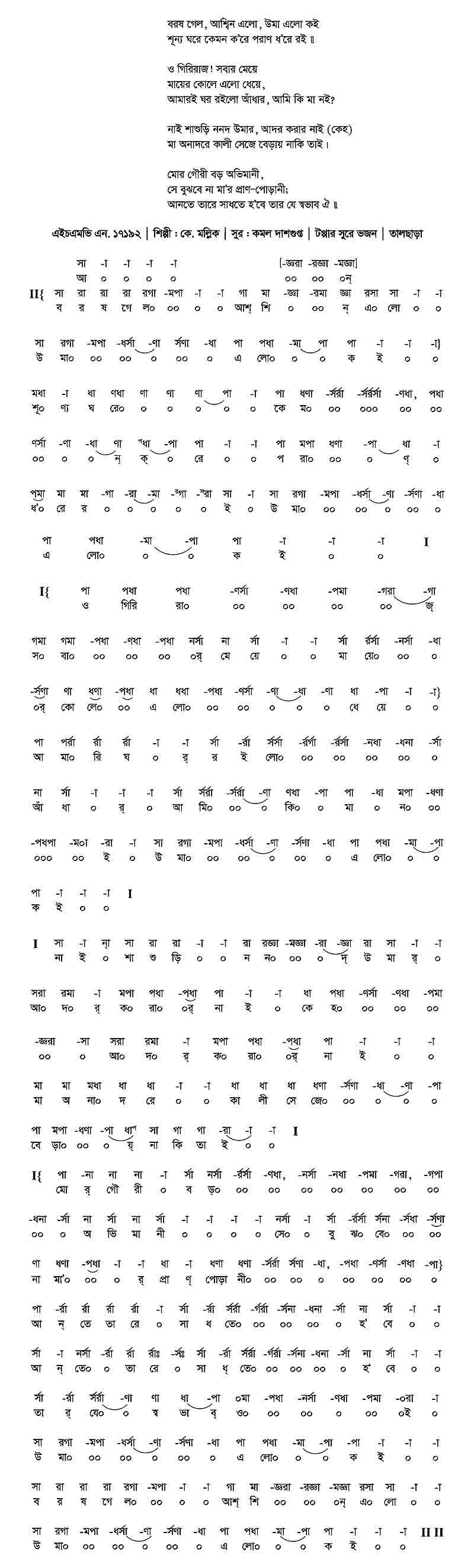 চোখের জলে মন ভিজিয়ে যায় চলে ঐ কোন্ উদাসী। বুকে কেন নীরব বীণা মুখে কেন নেইকো হাসি।। আকাশে চাঁদ তারার মেলা বনের পথে রঙের ডালা তবু কেন আঁখিতে ওর উথলে পড়ে অশ্রুরাশি।। বনের হাওয়ায় বাজিয়ে বেণু১, ছড়িয়ে চলে ফুলের রেণু বিদেশিকে আন্না ডেকে সাধ হয়েছে ভালবাসি।।