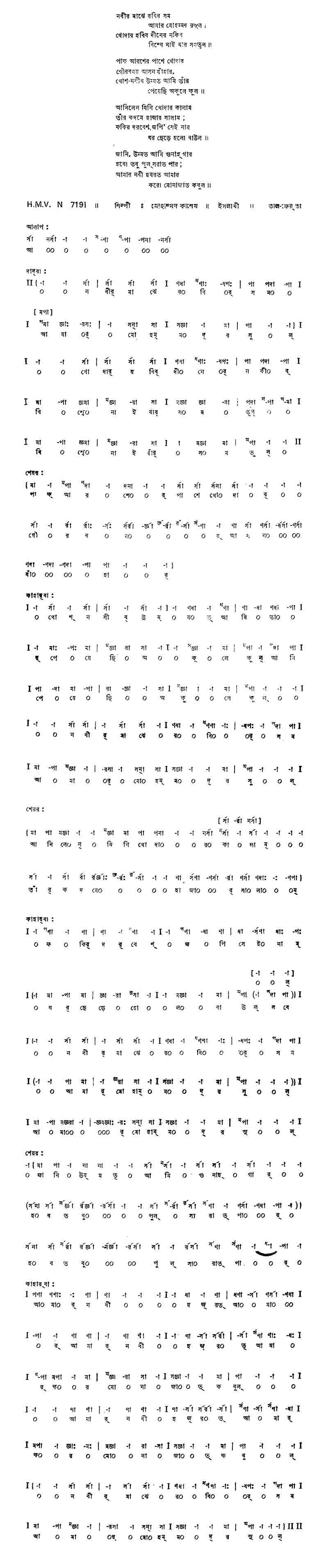 নবীর মাঝে রবির সম আমার মোহাম্মদ রসুল। খোদার হবিব দীনের নকিব বিশ্বে নাই যার সমতুল।। পাক আরশের পাশে খোদার গৌরবময় আসন যাঁহার, খোশ-নসীব উম্মত আমি তাঁর (আমি) পেয়েছি অকূলে কূল।। আনিলেন যিনি খোদার সালাম; তাঁর কদমে হাজার সালাম; ফকির দরবেশ জপি' সেই নাম (সবে) ঘর ছেড়ে হলো বাউল।। জানি, উম্মত আমি গুনাহগার হবো তবু পুলসরাত পার; আমার নবী হযরত আমার করো মোনাজাত কবুল।।