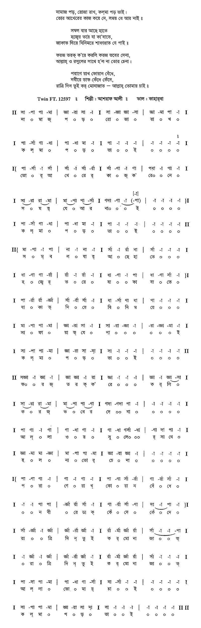 নামাজ পড়, রোজা রাখ, কল্মা পড় ভাই। তোর আখেরের কাজ করে নে, সময় যে আর নাই।। সম্বল যার আছে হাতে হজ্বের তরে যা কা'বাতে, জাকাত দিয়ে বিনিময়ে শাফায়াত যে পাই।। ফরজ তরক্ ক'রে কর্লি করজ ভবের দেনা, আল্লাহ ও রসুলের সাথে হ'ল না তোর চেনা। পরানে রাখ কোরআন বেঁধে, নবীরে ডাক কেঁদে কেঁদে্ রাত্রি দিন তুই কর মোনাজাত — আল্লাহ্ তোমায় চাই।।