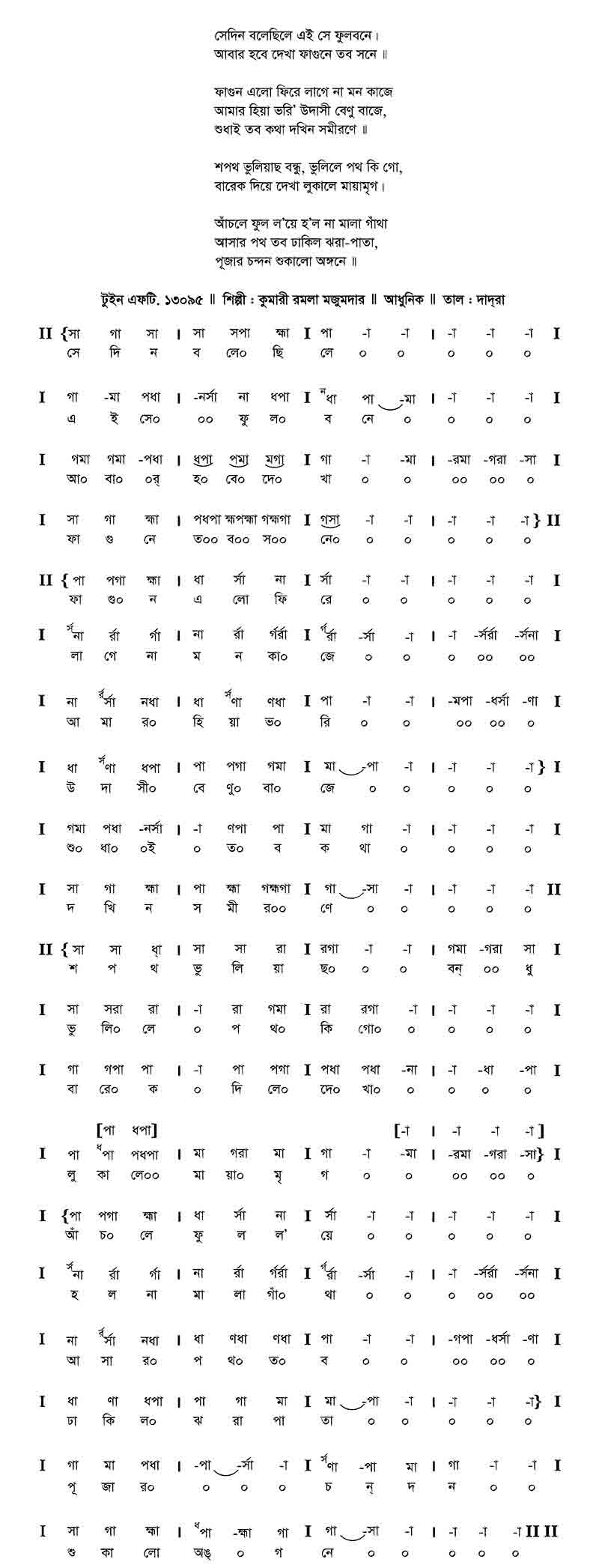 সেদিন ব’লেছিলে এই সে ফুলবনে, আবার হবে দেখা ফাগুনে তব সনে।। ফাগুন এলো ফিরে লাগে না মন কাজে, আমার হিয়া ভরি, উদাসী বেণু বাজে; শুধাই তব কথা দখিনা সমীরণে।। শপথ ভুলিয়াছ বন্ধু, ভুলিলে পথ কি গো, বারেক দিয়ে দেখা লুকালে মায়ামৃগ। আঁচলে ফুল লয়ে হল’ না মালা গাঁথা, আসার পথ তব ঢাকিল ঝরা পাতা; পূজার চন্দন শুকালো অঙ্গনে।।