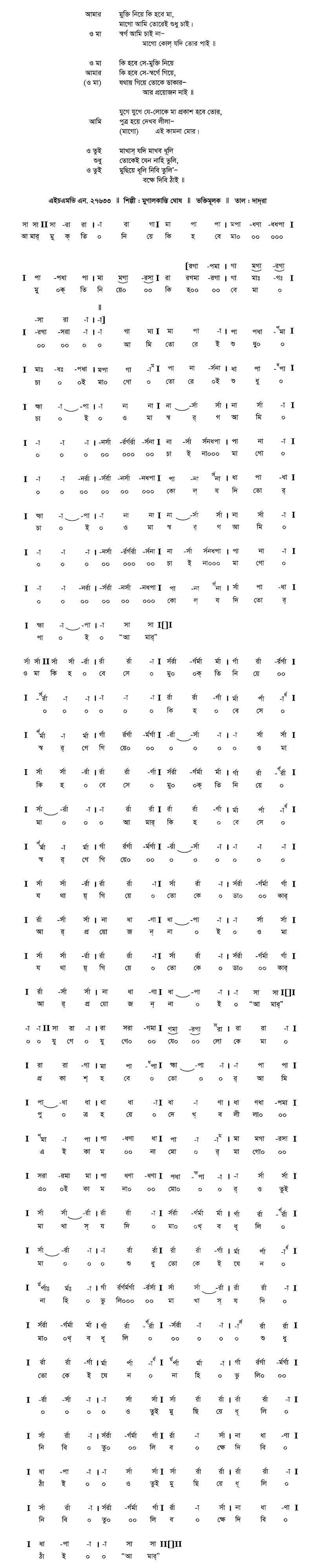আমার মুক্তি নিয়ে কি হবে মা, (মাগো) আমি তোরেই চাই স্বর্গ আমি চাইনে মাগো, কোল্ যদি তোর পাই॥ (মাগো) কি হবে সে মুক্তি নিয়ে, কি হবে সে স্বর্গে গিয়ে; যেথায় গিয়ে তোকে ডাকার আর প্রয়োজন নাই॥ যুগে যুগে যে লোকে মা প্রকাশ হবে তোর (আমি) পুত্র হয়ে দেখব লীলা এই বাসনা মোর। তুই, মাখাস্ যদি মাখ্ব ধূলি, শুধু তোকে যেন নাহি ভুলি; তুই, মুছিয়ে ধূলি নিবি তুলি বক্ষে দিবি ঠাঁই॥