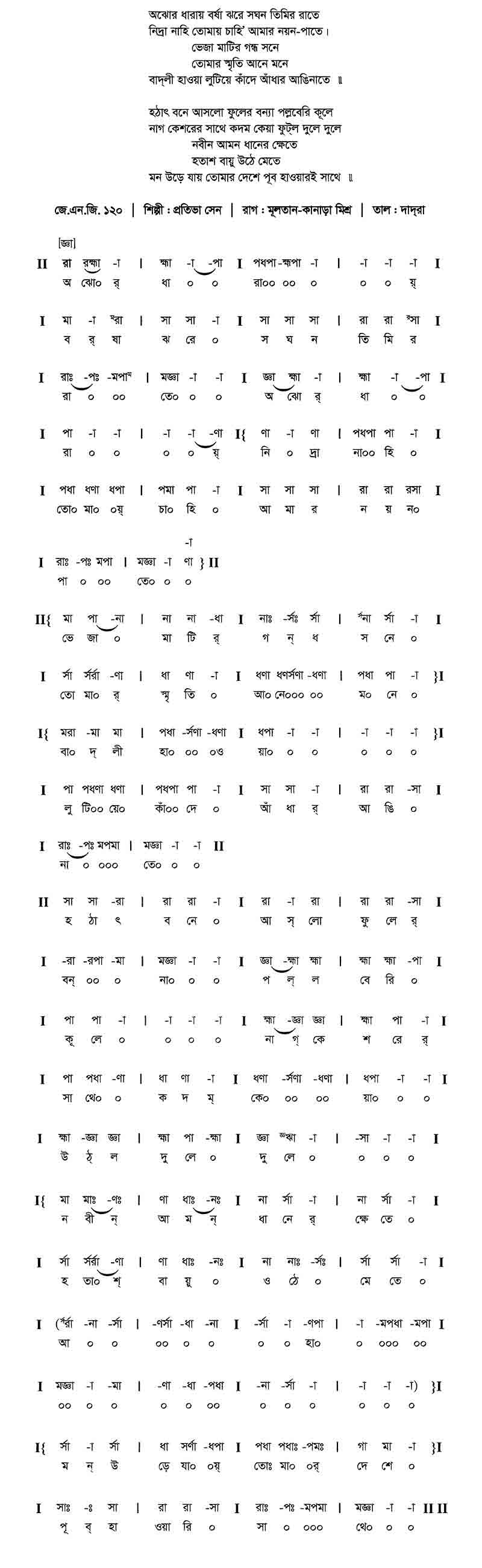 অঝোর ধারায় বর্ষা ঝরে সঘন তিমির রাতে। নিদ্রা নাহি তোমায় চাহি’ আমার নয়ন-পাতে॥ ভেজা মাটির গন্ধ সনে তোমার স্মৃতি আনে মনে, বাদ্লী হাওয়া লুটিয়ে কাঁদে আঁধার আঙিনাতে॥ হঠাৎ বনে আস্ল ফুলের বন্যা পল্লবেরই কূলে, নাগকেশরের সাথে কদম কেয়া ফুট্ল দুলে দুলে। নবীন আমন ধানের ক্ষেতে হতাশ বায়ু ওঠে মেতে, মন উড়ে যায় তোমার দেশে পূব-হাওয়ারই সাথে॥