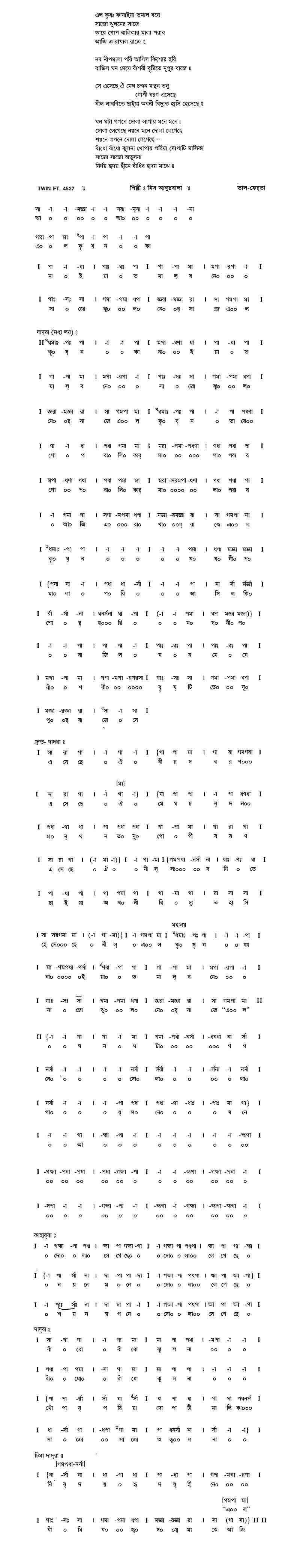 ফুল-ফাগুনের এলো মরশুম বনে বনে লাগল দোল্। কুসুম-সৌখিন দখিন হাওয়ার চিত্ত গীত-উতরোল।। অতনুর ঐ বিষ-মাখা শর নয় ও-দোয়েল শ্যামার শিস্, ফোটা ফুলে উঠ্ল ভ’রে কিশোরী বনের নিচোল।। গুল্বাহারের উত্তরী কার জড়াল তরু-লতায়, মুহু মুহু ডাকে কুহু তন্দ্রা-অলস, দ্বার খোল। রাঙা ফুলে ফুল্ল-আনন দোলে কানন-সুন্দরী, বসন্ত তার এসেছে আজ বরষ পরে পথ-বিভোল্।