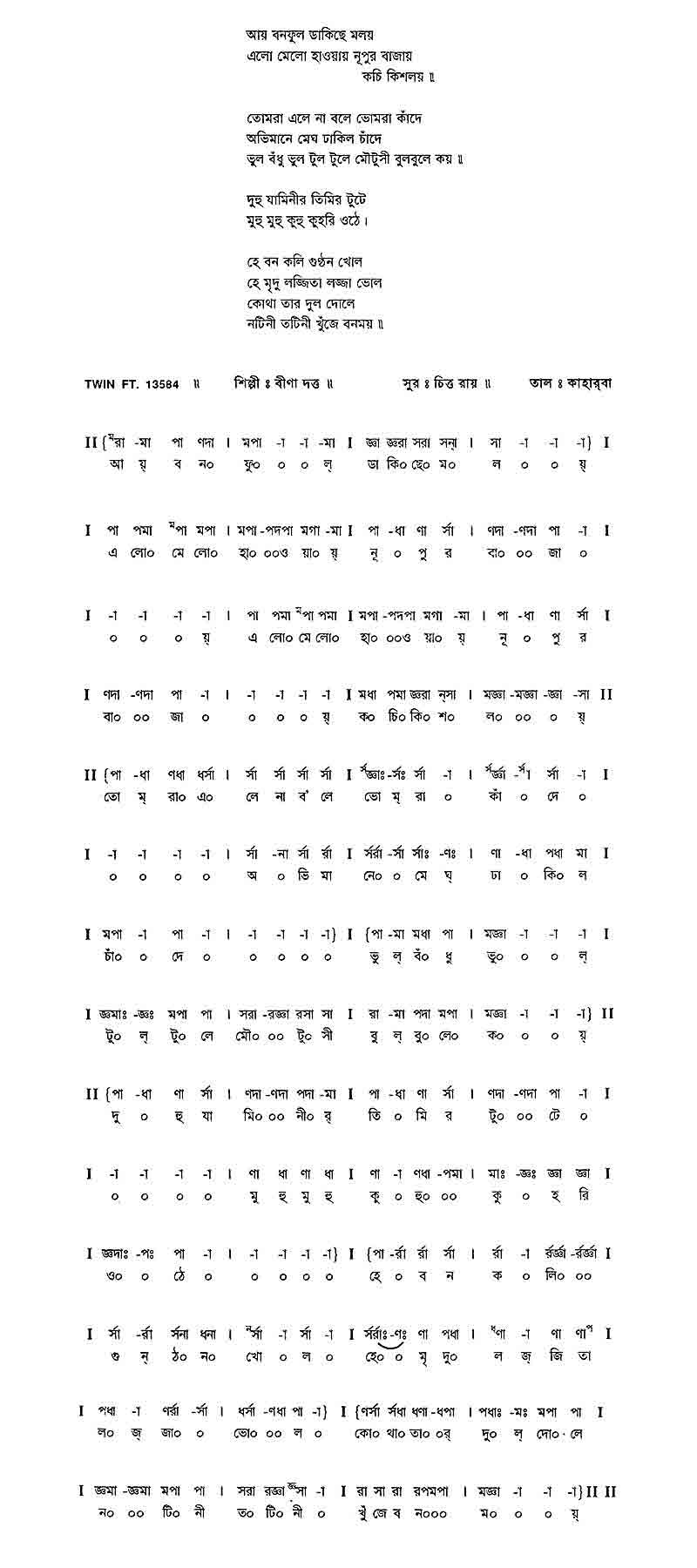 আয় বনফুল ডাকিছে মলয় এলোমেলো হাওয়ায় নূপুর বাজায় , কচি কিশলয়।। তোমরা এলে না ব'লে - ভোমরা কাদেঁ অভিমানে মেঘ ঢাকিল চাদেঁ 'ভুল বঁধু ভুল' টুলটুলে মৌটুসি বুলবুলে কয়।। কুহু যামিনীর তিমির টুটে মুহু মুহু কুহু কুহরি ওঠে। হে বন-কলি, গুণ্ঠন খোলো হে মৃদুলজি্জিতা, লজ্জা ভোলো, কোথা তার দুল দোলে নটিনী তটিনী খুজেঁ বনময়।।