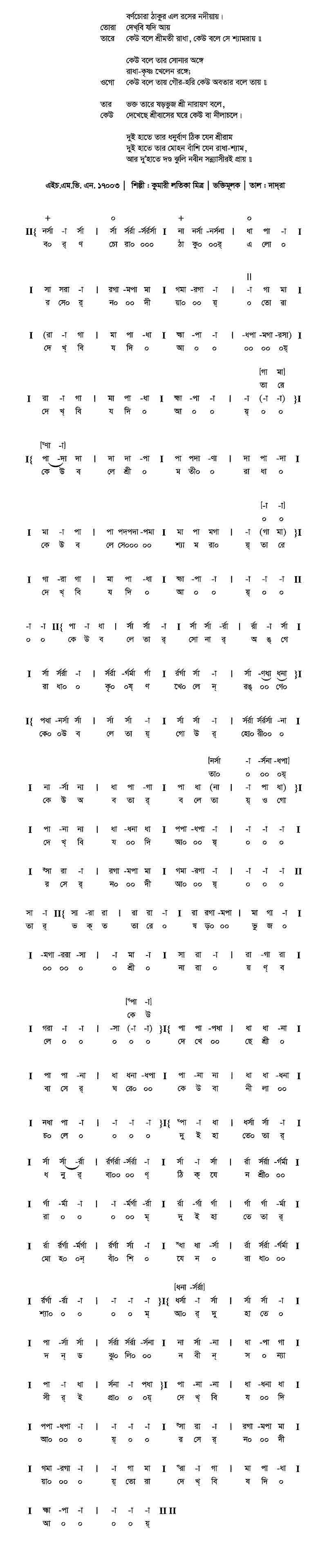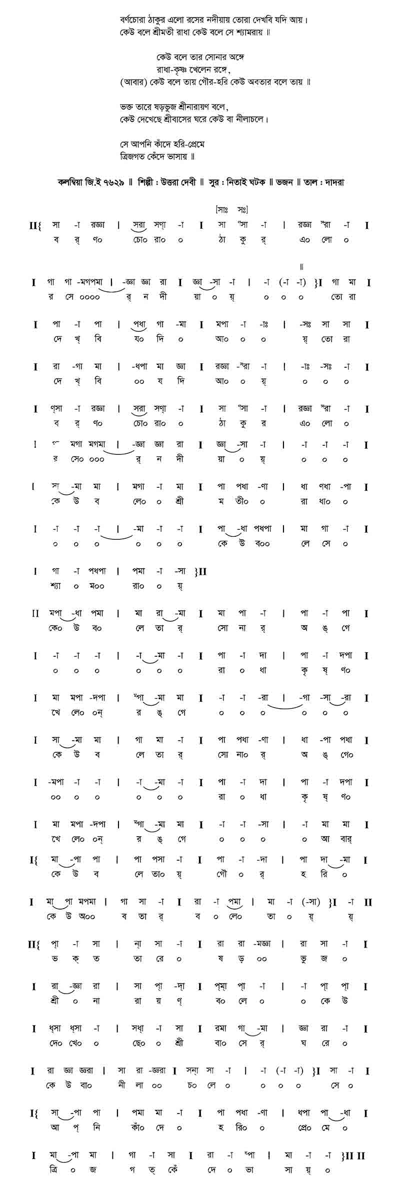 বর্ণচোরা ঠাকুর এলো রসের নদীয়ায় তোরা দেখবি যদি আয় তারে কেউ বলে শ্রীমতি রাধা কেউ বলে সে শ্যামরায়।। কেউ বলে তার সোনার অঙ্গে রাধা-কৃষ্ণ খেলেন রঙ্গে; ওগো কেউ বলে তায় গৌর-হরি কেউ অবতার বলে তায়।। তার ভক্ত তারে ষড়ভুজ শ্রী নারায়ণ বলে, কেউ দেখেছে শ্রীবাসের ঘরে কেউ বা নীলাচলে। দুই হাতে তার ধনুর্বাণ ঠিক যেন শ্রীরাম, দুই হাতে তার মোহন বাঁশি যেন রাধা-শ্যাম, আর দু'হাতে দণ্ড ঝুলি নবীন সন্ন্যাসীরই প্রায়।।