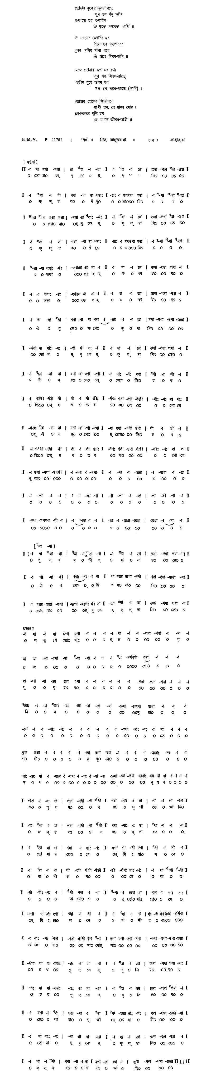মাধবী-তলে চল মাধবিকা-দল আইল সুখ-মধুমাস। বহিছে খরতর থরথর মরমর উদাস চৈতী-বাতাস।। পিককুল কলকর অবিরল ভাষে, মদালস মধুপ পুষ্পল বাসে। বেণু-বনে উঠিছে নিশাস।। তরুণ নয়ন সম আকাশ আনীল, তট-তরু-ছায়া ধরে নীর নিরাবিল বুকে বুকে স্বপন-বিলাস।।