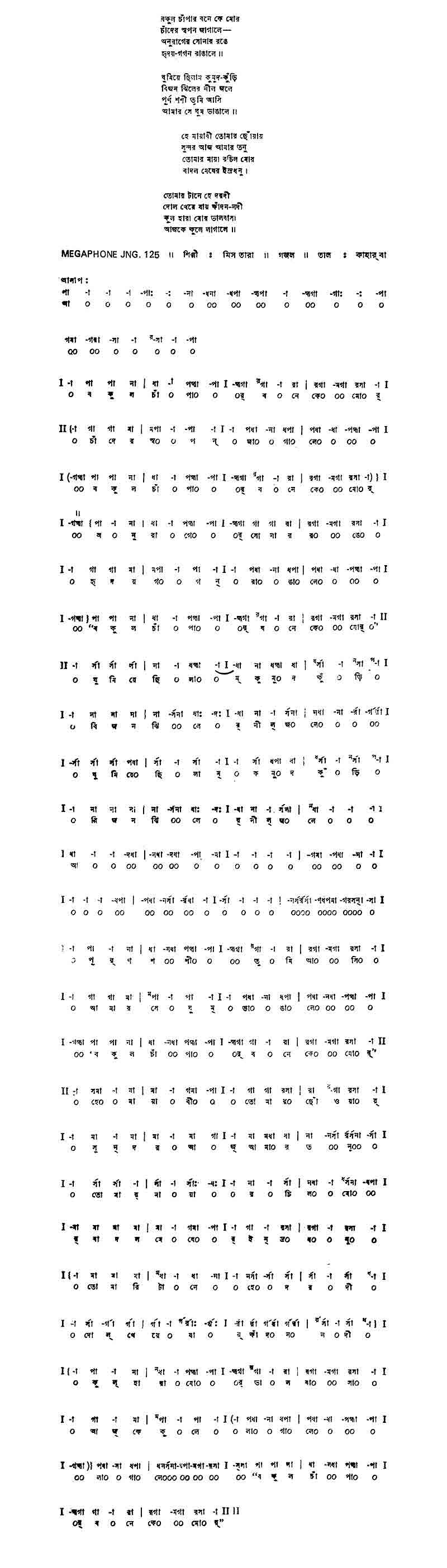 বকুল চাঁপার বনে কে মোর চাঁদের স্বপন জাগালে — অনুরাগের সোনার রঙে হৃদয়-গগন রাঙালে।। ঘুমিয়ে ছিলাম কুমুদ-কুঁড়ি বিজন ঝিলের নীল জলে পূর্ণ শশী তুমি আসি’ আমার সে ঘুম ভাঙালে।। হে মায়াবী তোমার ছোঁয়ায় সুন্দর আজ আমার তনু তোমার মায়া রচিল মোর বাদল মেঘে ইন্দ্র ধনু। তোমার টানে হে দরদি দোল খেয়ে যায় কাঁদন-নদী কূল হারা মোর ভালোবাসা আজকে কূলে লাগালে।।